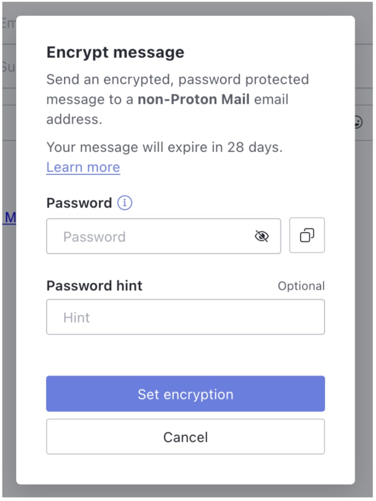 Message expiration is just one example of the powerful privacy tools offered in Proton Mail, which include end-to-end encryption, password-protected emails, and other advanced security features(new window). Because of our end-to-end and zero-access encryption, nobody can see the contents of your emails but you — not even Proton.