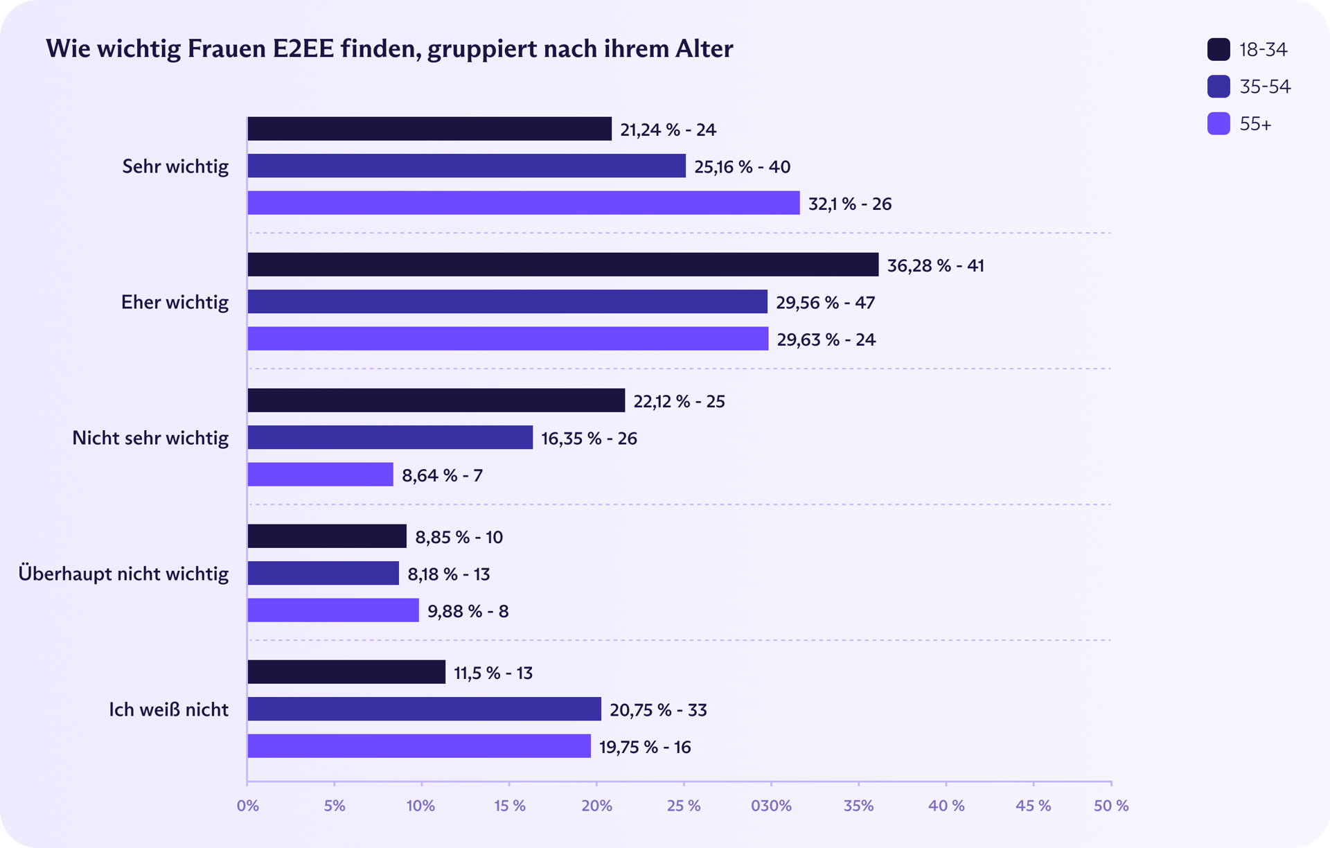 Es gab große alterabhängige Unterschiede dabei, was die Bedeutung betrifft, die die Befragten E2EE beimaßen. Junge Männer sind die Vorreiter für E2EE in Frankreich – 38 % der Männer im Alter von 18 bis 34 Jahren sagen, es sei „sehr wichtig“. Am anderen Ende der Skala bezeichneten nur 19 % der Männer ab 55 Jahren E2EE als sehr wichtig. Frauen im Alter von 18 bis 34 Jahren zeigten ebenfalls relativ wenig Begeisterung, wobei nur 21 % es als sehr wichtig einstuften. Alle anderen Bevölkerungsgruppen liegen zwischen 25 und 32 %.