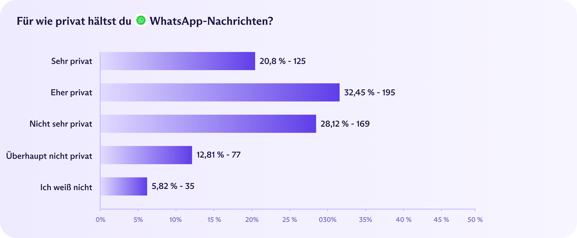 Trotz dieser Fakten gaben 53 % der Deutschen immer noch an, WhatsApp sei „sehr privat“ oder „eher privat“, und nur 51 % sagten, sie würden einen Wechsel zu einem privateren Messaging-Dienst in Betracht ziehen.