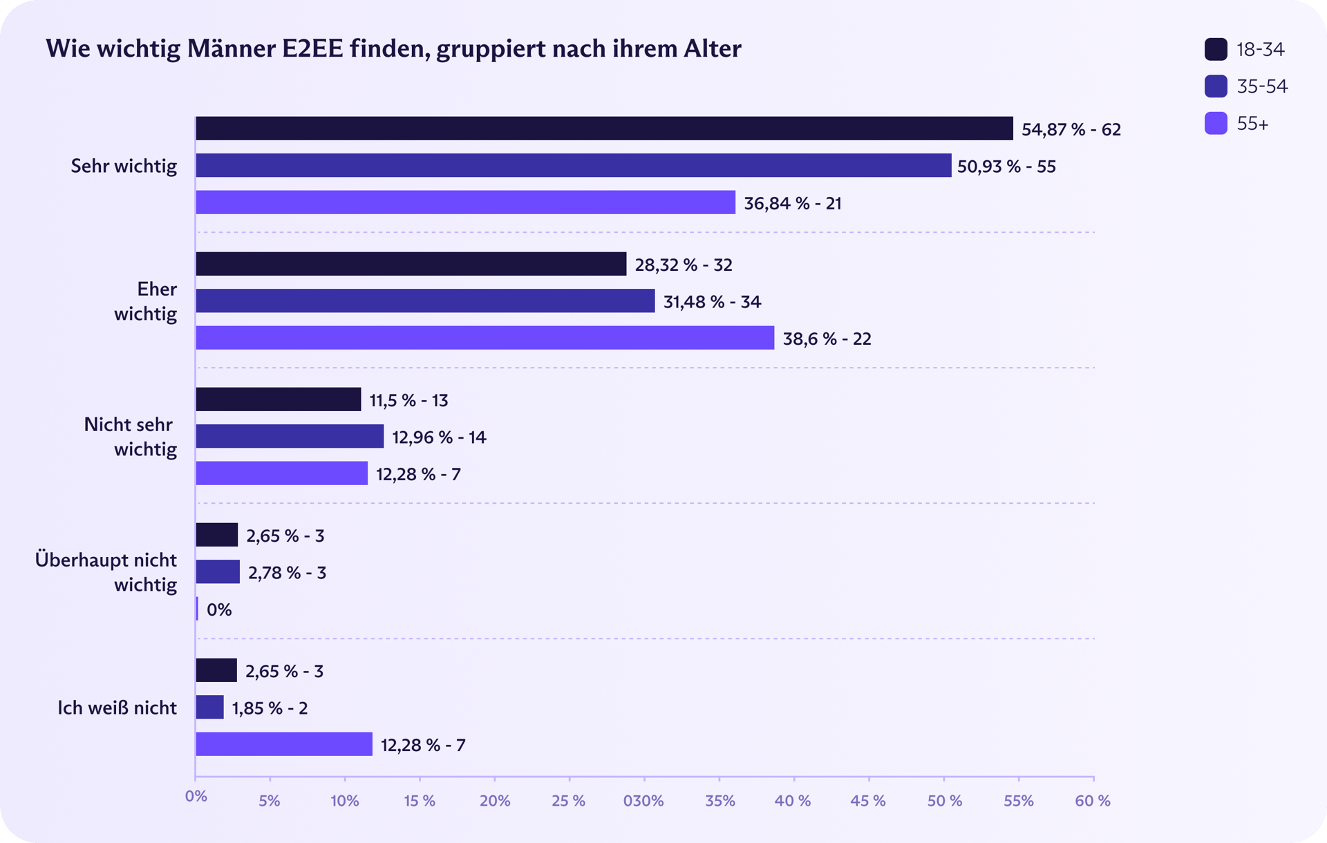 Allerdings gaben 47 % der Frauen zwischen 35 und 54 Jahren und der Frauen über 55 an, dass E2EE wichtig sei, deutlich mehr als Männer über 55 (37 %) oder Frauen unter 34 (41 %).
