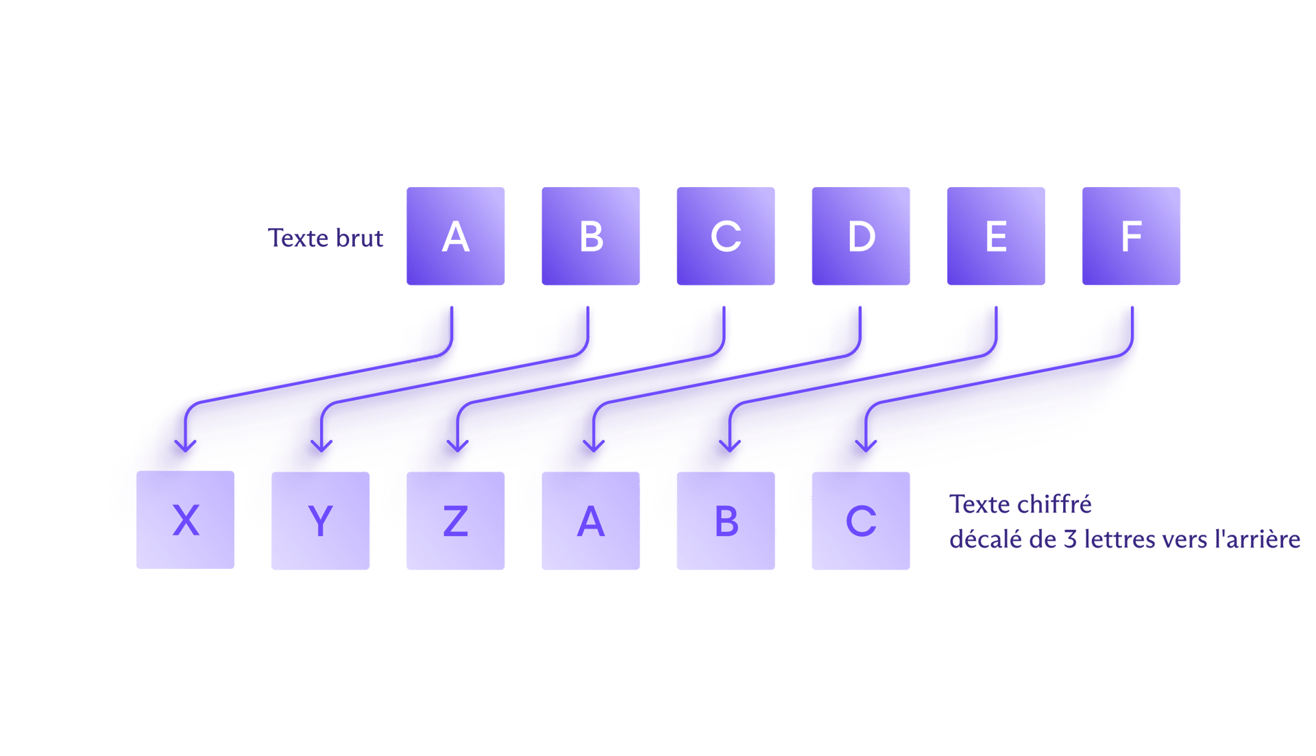 L'un des exemples de chiffrement les plus connus est le chiffre de César, utilisé par Jules César pour garder ses messages privés. Dans ce chiffre, chaque lettre du texte original est remplacée par une autre lettre décalée d'un nombre fixe de positions vers le haut ou vers le bas dans l'alphabet. Par exemple, en décalant de trois positions vers l'arrière, « A » devient « X » dans le texte chiffré, « B » devient « Y », et ainsi de suite.