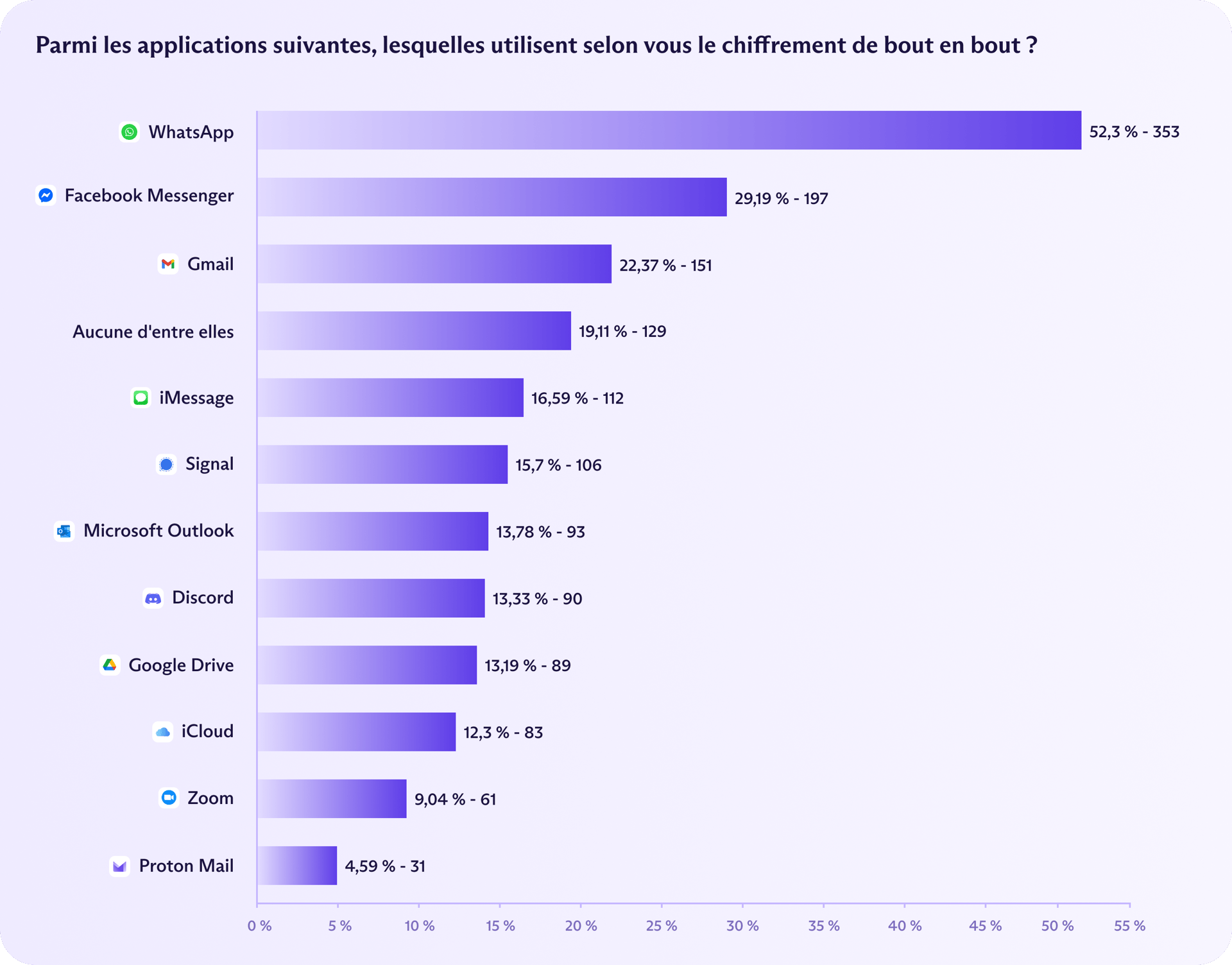Facebook Messenger, qui a adopté le chiffrement de bout en bout (E2EE) par défaut en 2023, a été reconnu par 29 %.
