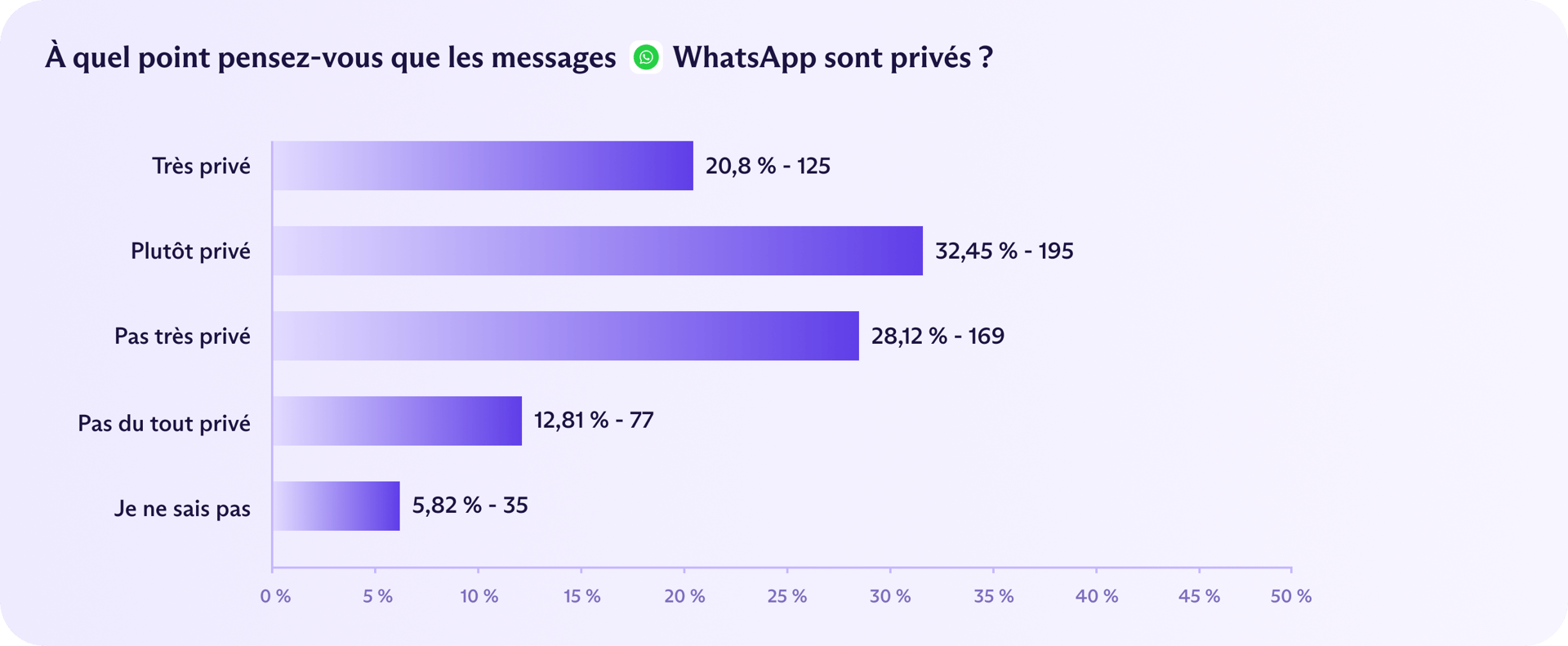 Malgré ces faits, 53 % des Allemands ont tout de même déclaré que WhatsApp était « très privé » ou « assez privé » et seulement 51 % ont déclaré qu'ils envisageraient de passer à un service de messagerie plus privé.