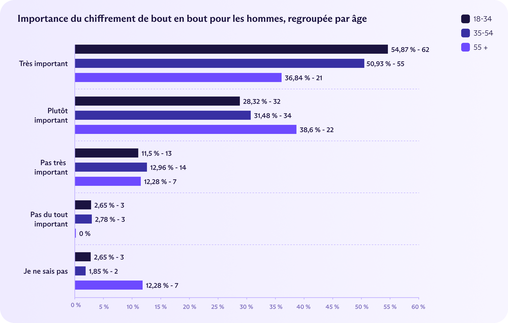 Cependant, 47 % des femmes âgées de 35 à 54 ans et des femmes de plus de 55 ans ont déclaré que l'E2EE était important, bien plus que les hommes de plus de 55 ans (37 %) ou les femmes de moins de 34 ans (41 %).