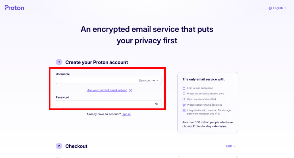 • If you’re new to Proton, enter a username (this will also be your Proton Mail email address) and password.